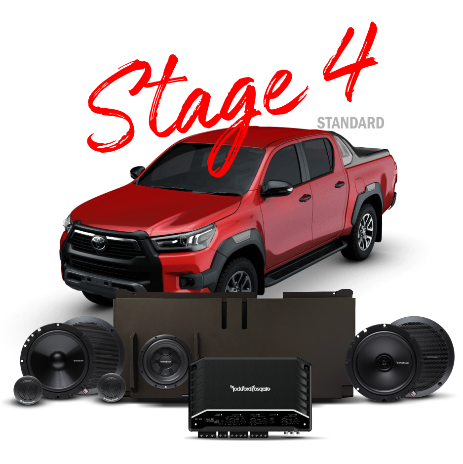This stage offers full sound deadening to keep the music in & keep the exterior sounds out. The specifically designed Subwoofer box hugs the rear of the vehicle for maximum internal space giving the ultimate bass solution for your Hilux.