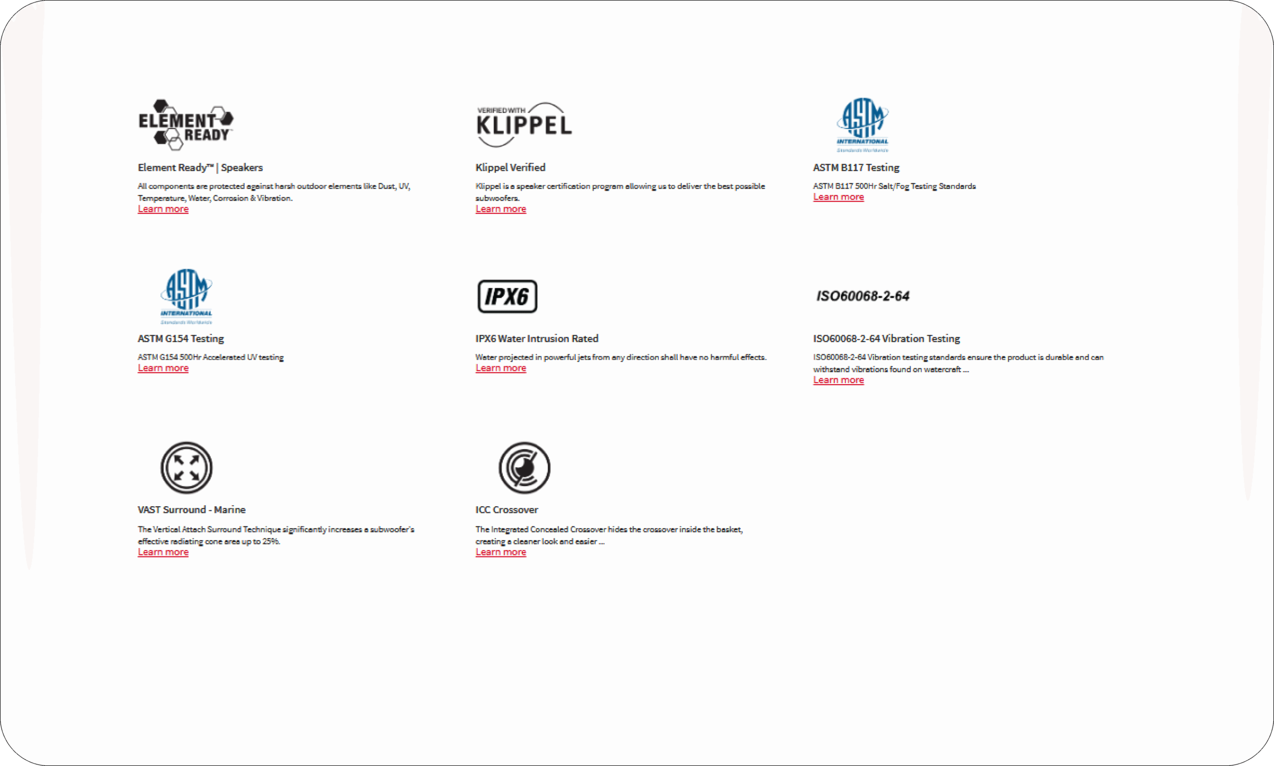 The M1 series of Element Ready™ speakers are designed to pair with the Rockford Fosgate Color Optix™ Controller and RF Connect App through its Deutsch™ and Amphenol™ connectors integrated into the speaker. This combined with their IP67 certification make these speakers Element Ready™ and truly purpose built for marine applications. To complete your sound experience, the M1 speakers are complimented by 8-inch, 10-inch and 12-inch subwoofers, also controlled through the Color Optix™ lighting system.