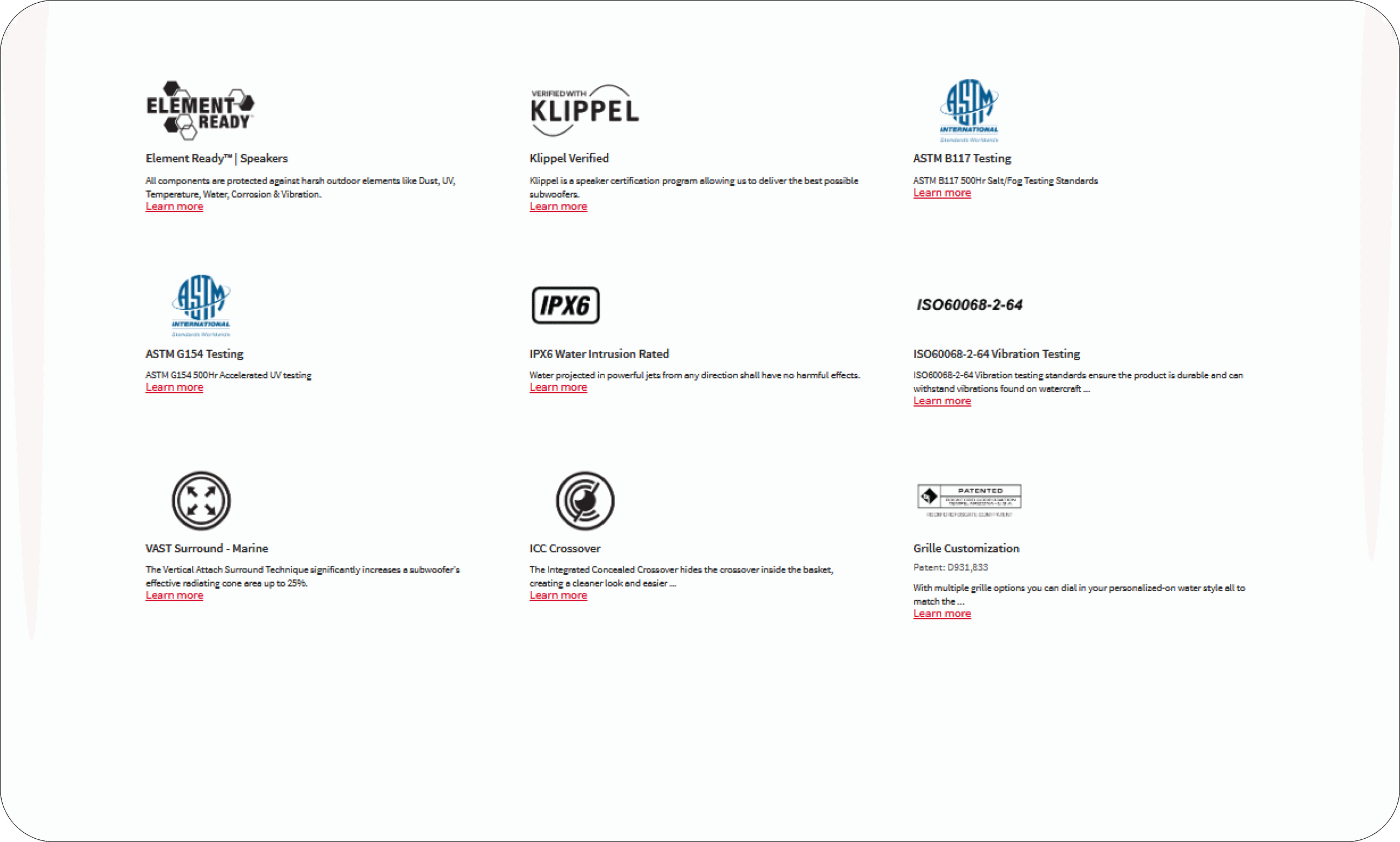 The M2 series of Element Ready™ speakers are designed to pair with the Rockford Fosgate Color Optix™ Controller and RF Connect App through its Deutsch™ and Amphenol™ connectors integrated into the speaker. This combined with their IP67 certification make these speakers Element Ready™ and truly purpose built for marine applications. To complete your sound experience, the M2 speakers are complimented by 10-inch Infinite Baffle subwoofers, also controlled through the Color Optix™ lighting system.