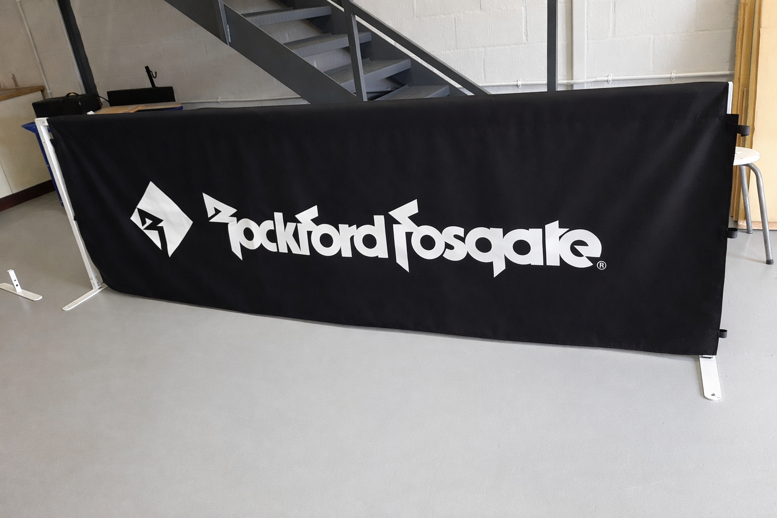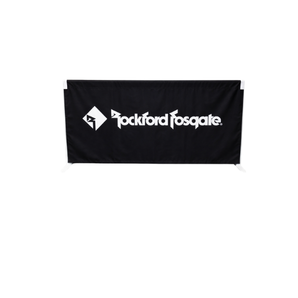The Large Black Rockford Edition Railskirt provides a sleek, professional finish for any premium display or event setup. It features the iconic Rockford Fosgate name and signature diamond logo prominently displayed in high-contrast white across the front, ensuring clear brand visibility